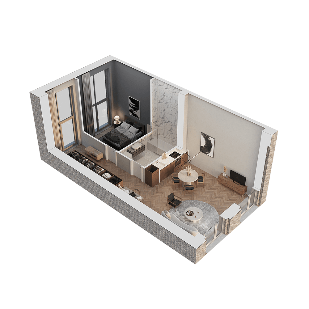 Butai parduodami be pertvarų. Pateikiamas galimo įrengimo pavyzdys.