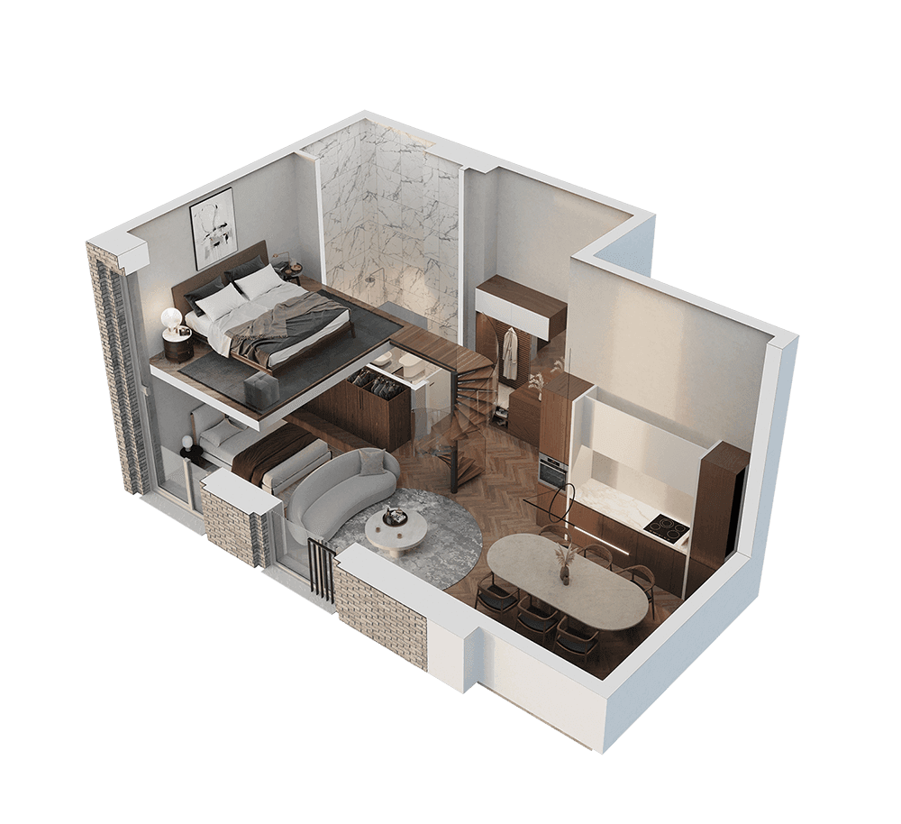 Butai parduodami be pertvarų. Pateikiamas galimo įrengimo pavyzdys.