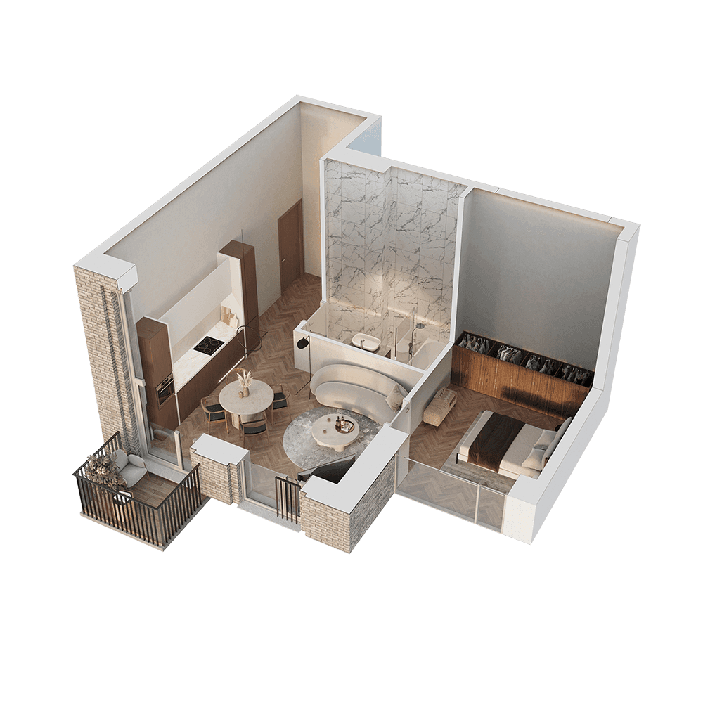 Butai parduodami be pertvarų. Pateikiamas galimo įrengimo pavyzdys.