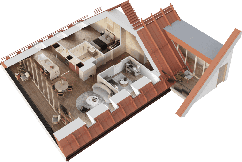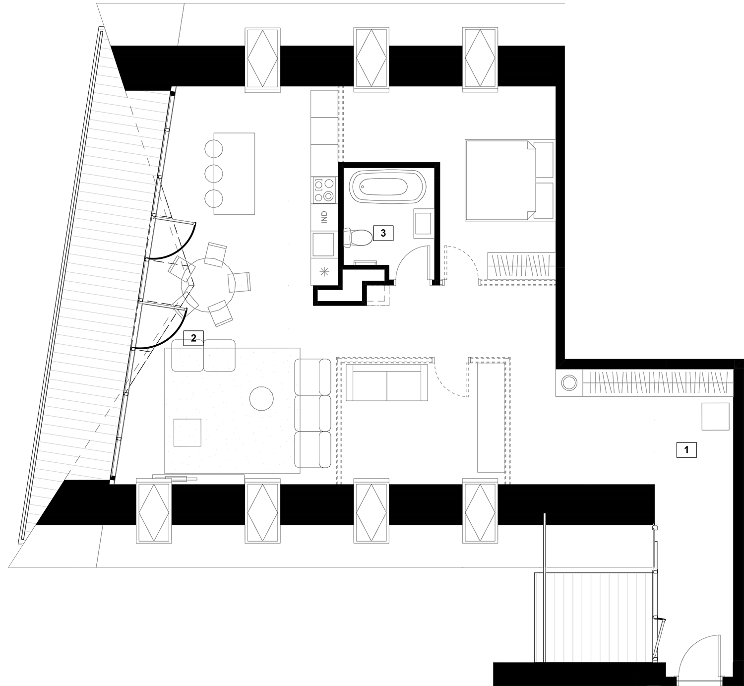 Butai parduodami be pertvarų. Pateikiamas galimo įrengimo pavyzdys.