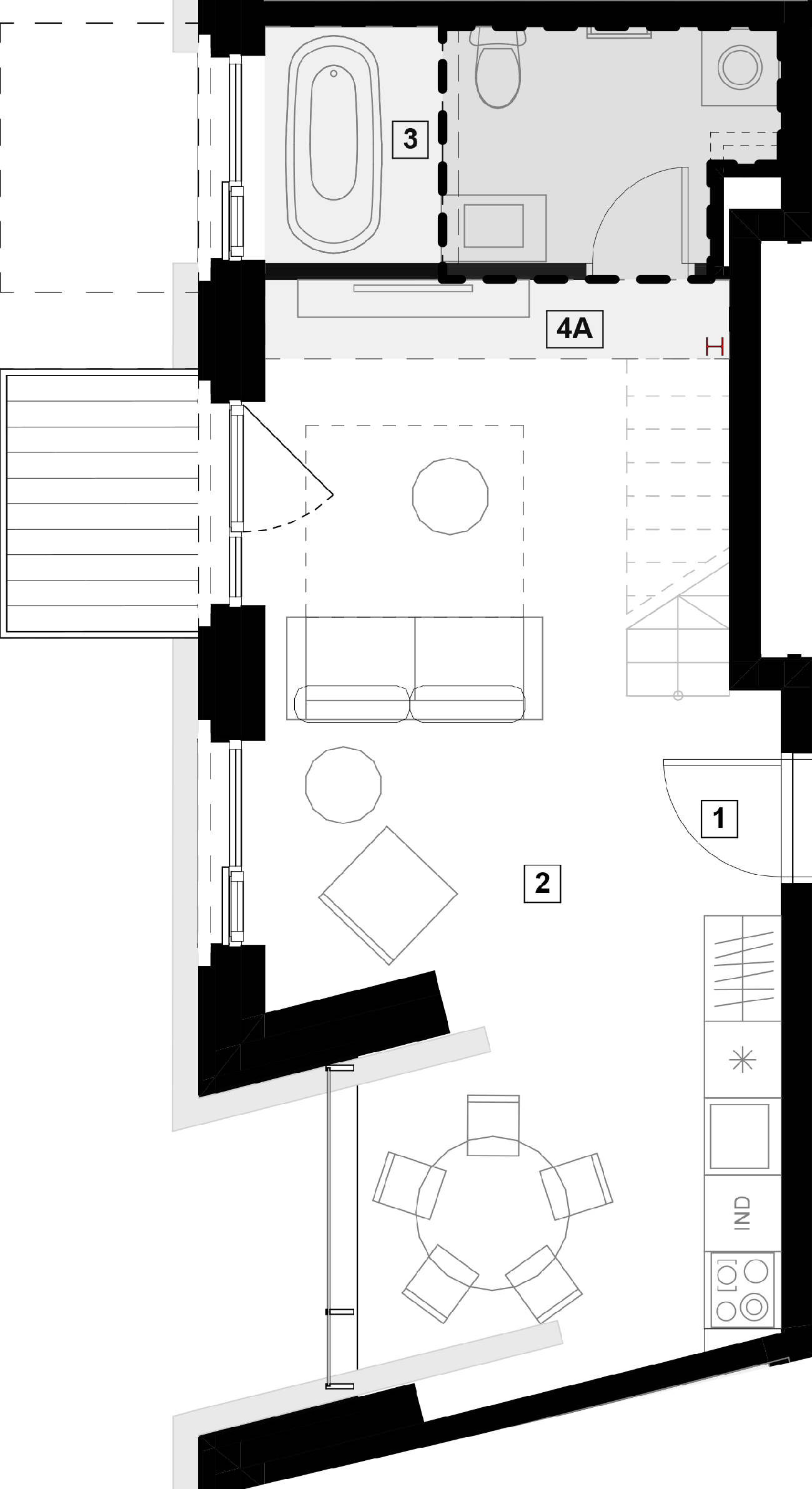 Butai parduodami be pertvarų. Pateikiamas galimo įrengimo pavyzdys.