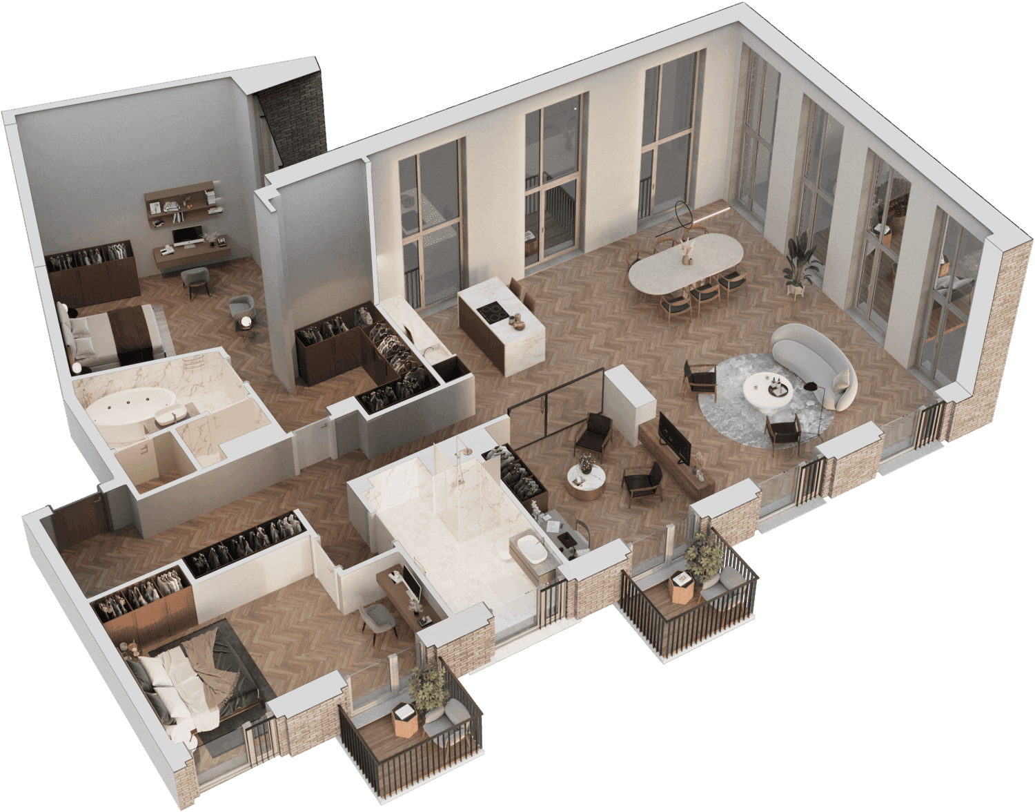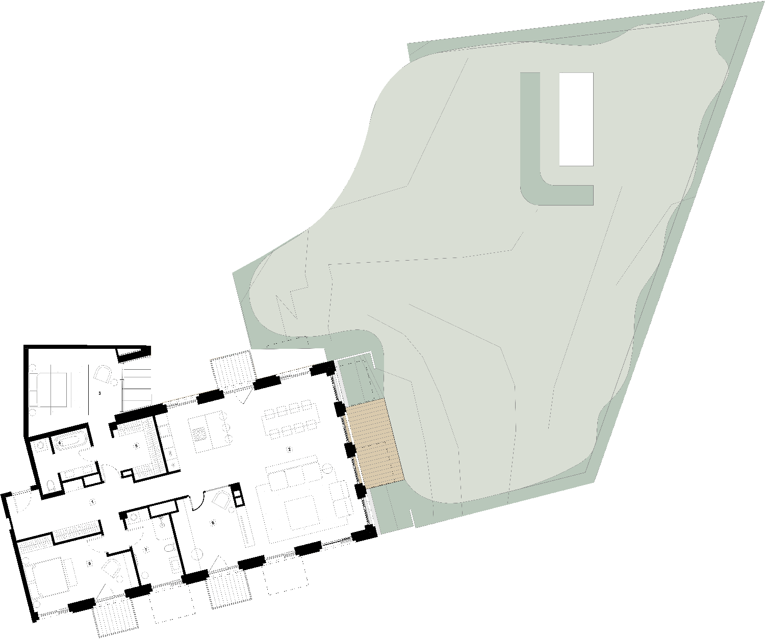 Butai parduodami be pertvarų. Pateikiamas galimo įrengimo pavyzdys.
